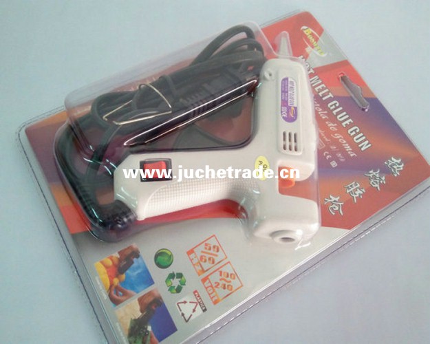 【产品应用及特点】:本款热熔胶枪的发热芯采用高科技PTC陶瓷恒温发热体制作而成,电气绝缘强度3750V/分钟不击穿,耐电压330V/3分钟,配置耐高温绝缘工程塑料外壳,专有开关设计,内置安全电源保险丝,电源指示,采用环保导热快的合金铝压铸成一体枪膛,使用更安全,寿命长,质量稳定,手感好,人性化设计,长期打胶不伤手,是目前用户使用最广泛的一款小功率热熔胶枪,使用行业范围广,适合粘胶用量小的产品加工,如手工艺品,发制品,圣诞礼品,毛绒玩具,皮革布料,食品包装,彩盒包装等厂家粘接产品的理想工具。适合使用软化点为80度左右的EVA热熔胶棒,热熔胶条。